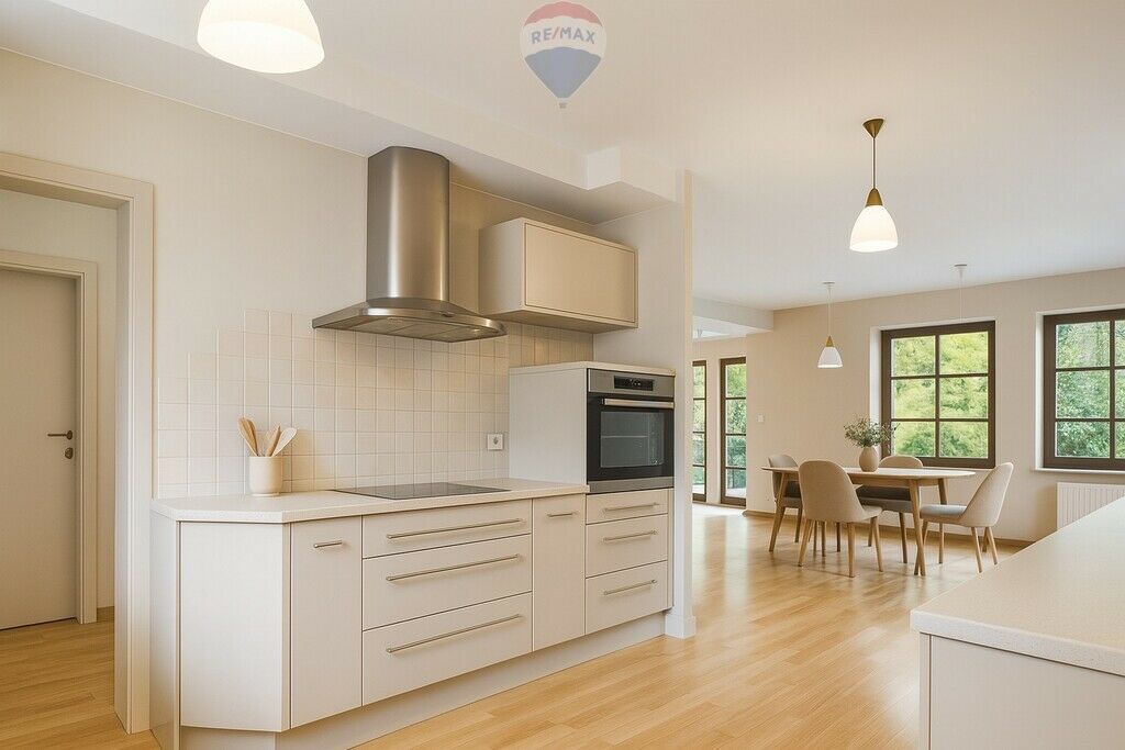 Przestronny salon połączony z aneksem kuchennym, co stwarza idealne